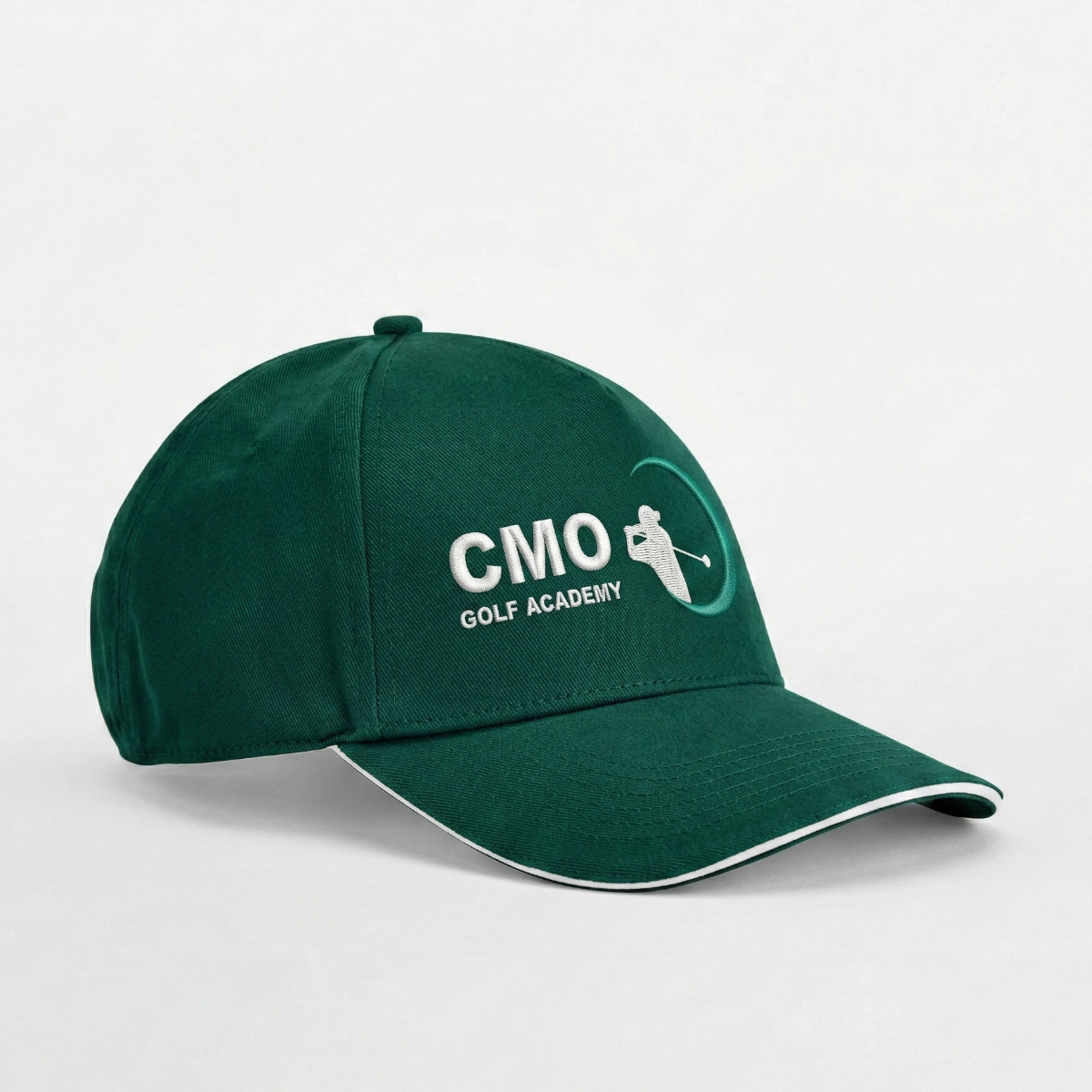 Klasyczna, ciemnozielona czapka z daszkiem sygnowana wyhaftowanym logo „CMO GOLF ACADEMY”. Łączy sportową funkcjonalność z eleganckim designem, idealna zarówno na pole golfowe, jak i do codziennego noszenia.